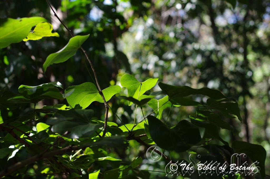 Bauhinia malabarica grows as a multi trunk small tree or very large multi stemmed shrub. The boles are about a third of the height of the tree and measure 250mm to 300mm in diameter. The trunk is pale grey to grey-brown rough and scabrous to the medium size branches. Branches are thin pale grey and glabrous to slightly scabrous. The juvenile branchlets and small branchlets where the leaves are pale grass green, glabrous and have a slight zig zag form as they approach the apex. Leaf scars remain after the leaves have been discarded