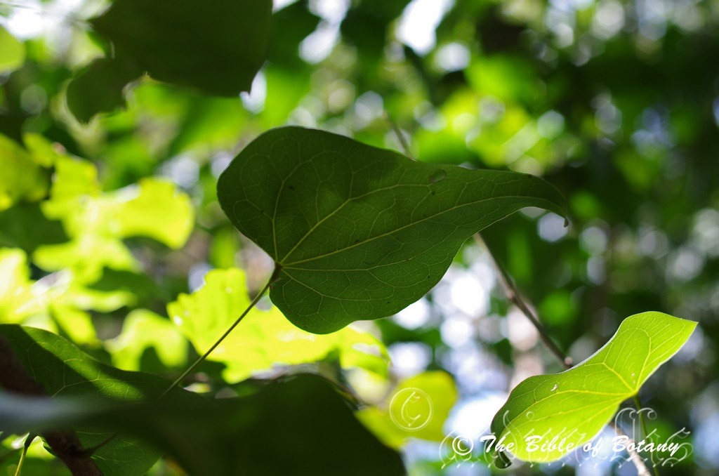 Bauhinia malabarica’s alternate bi-compound leaflets are broad reniform and measure 45mm to 90mm in length by 60mm to 110mm in width. The base is strongly oblique while the apex is broadly oblique-obtuse and strongly emarginated between the two lobes. The concolourous laminas are mid blue-green to deep blue-green and glabrous on the upper lamina while the lower lamina is sparsely covered in short white to fawn puberulent hairs. The leaf margins are entire. There are 9 to 11 slightly prominent longitudinal veins radiating from the base on the lower lamina. Some are clearly visible on the upper lamina. The petioles measure 25mm to 40mm in length while the leaflets are sessile. The stipules are covered in fawn hirsute hairs and measure 1mm to 1.5 mm in length.