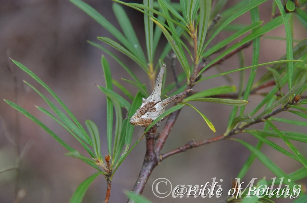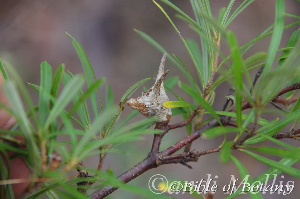 Leptomeria drupacea’s is a small erect parasitic plant that attaches itself to the roots of the host plant. The bark is grey brown and flaky often hangs on the trunk and lower branches. The green to grey-green branchlets are semi terete, striate and somewhat glaucous.