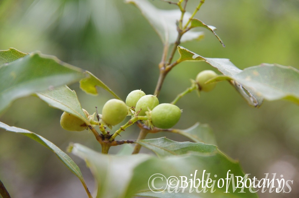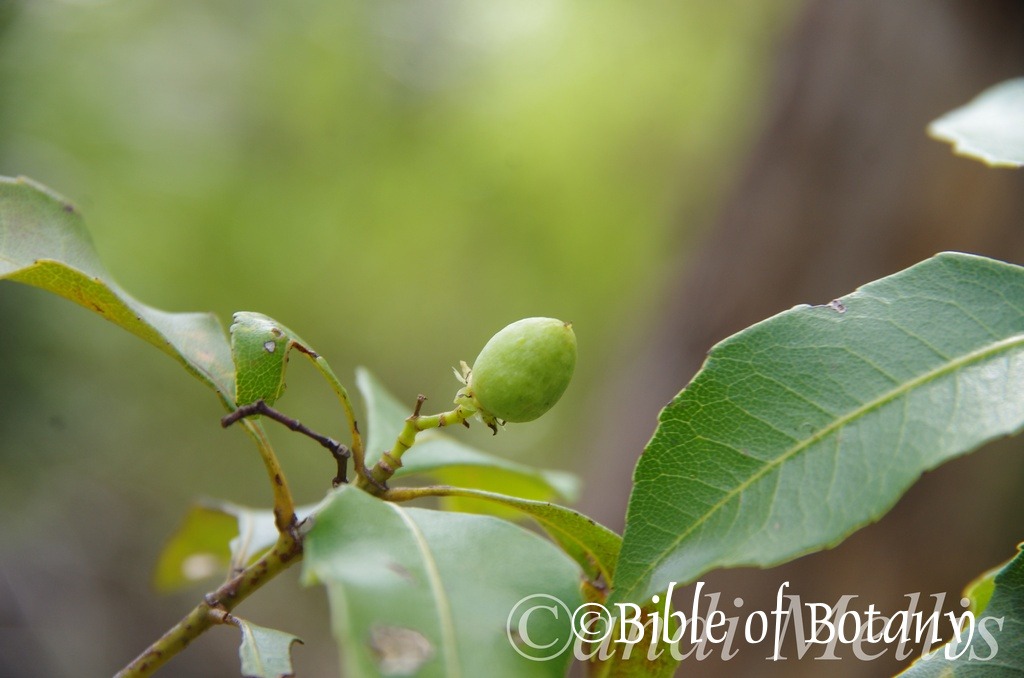 The fruits are obovoid, plano-convex nuts. The smooth, glossy green nuts turn grey-brown to deep brown when ripe. The nuts measure 2mm to 2.5mm in length by 1.2mm to 1.5mm in diameter.